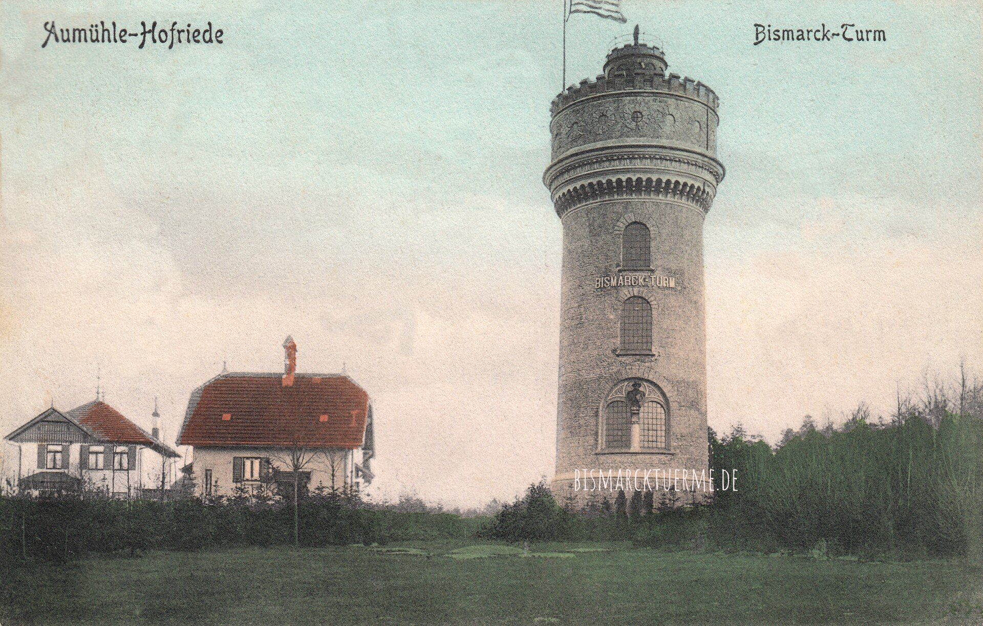 Der Besitzer der Villenkolonie Sachsenwald-Hofriede, Emil Specht, regte den Bau dieses Bismarckturmes im Jahr 1897, noch zu Lebzeiten Bismarcks, an. Emil Specht hatte zuvor das Grundstück neben der Station Aumühle, der höchsten Erhebung von Aumühle (39 m über NN) von Otto von Bismarck erworben und darauf eine Villenkolonie angelegt.