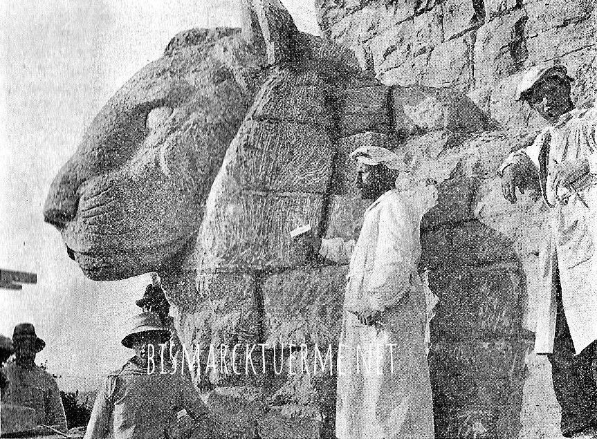 Das 5,00 m x 2,00 m große Hauptportal der Warte lag auf der Nordseite. Das Portal war von halbrunden Säulen umrahmt und oberhalb des Sturzes mit einem steinernen Löwen (5,50 m breit und 4,00 m hoch) bekrönt. Der Löwe, der aus 25 m³ Gestein bestand und 65 t wog, sollte als Sinnbild für die Kraft Bismarcks stehen. Unterhalb des Löwen (von Tier-Bildhauer August Gaul geschaffen) war die steinerne (erhabene) Aufschrift
