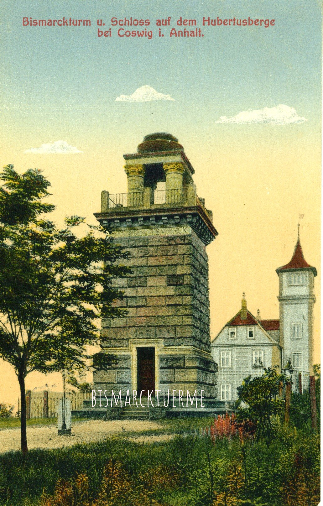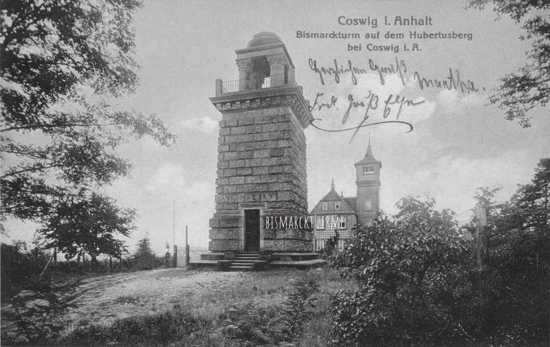 Am 28.07.1899 erschien in der Coswiger Zeitung ein Aufruf zum Bau eines Bismarckturmes, in dem bereits die höchste Erhebung des Hubertusberges (142 m über NN) als Turmstandort angegeben worden war. In dem Aufruf warben 123 Ausschussmitglieder, überwiegend Handwerksmeister und Fabrikbesitzer aus Coswig, aber auch Personen aus anderen Gemeinden in Anhalt, um Spenden. Als weitere Agitatoren waren Dr. Moritz Beyer und Alexis Bischof, Eigentümer einer Zündholzfabrik, aktiv.