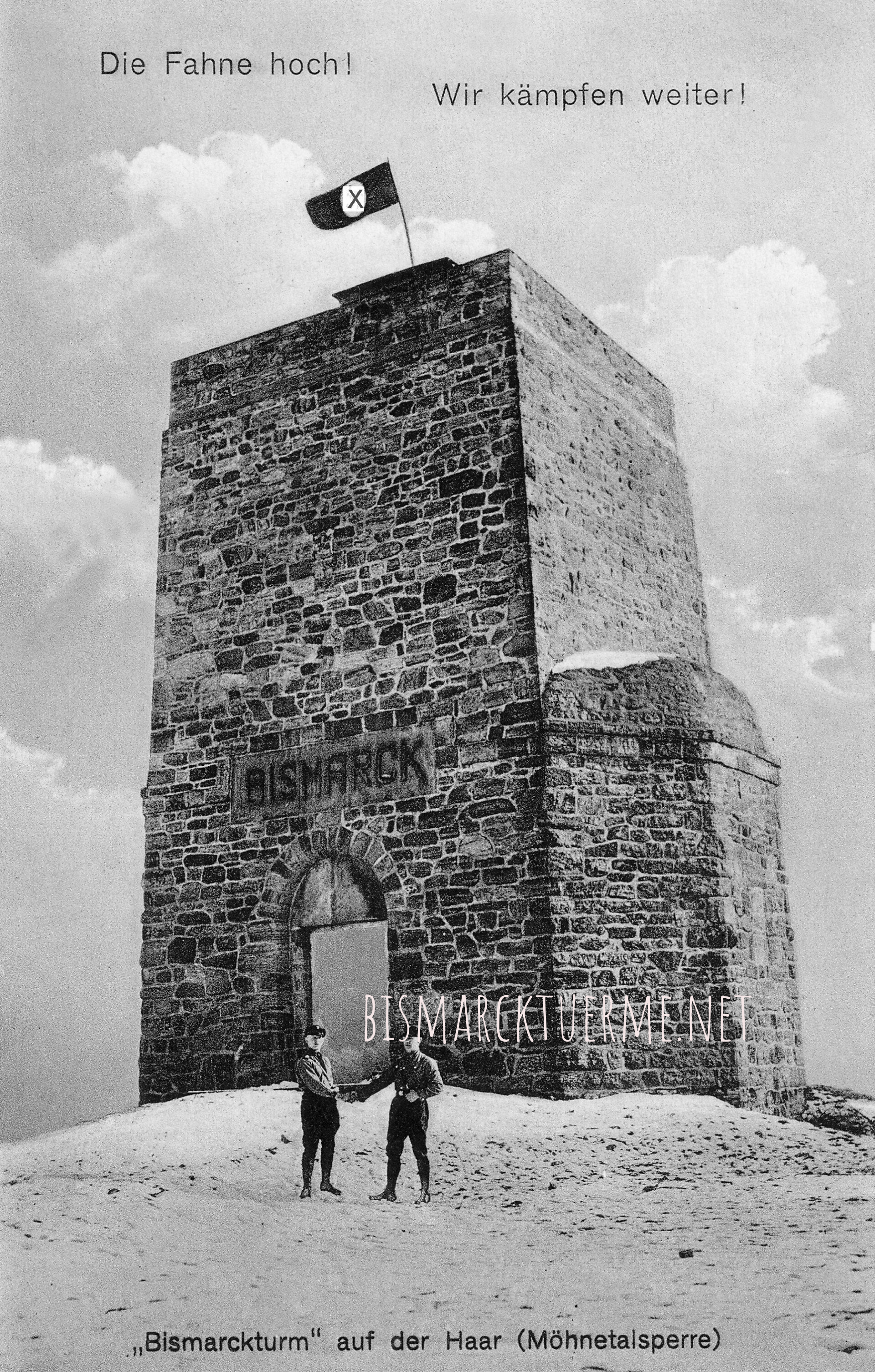 Ansichtskartenmotiv Turmstumpf Bismarckturm Delecke 1932 (HK-Motiv auf Fahne unkenntlich gemacht)