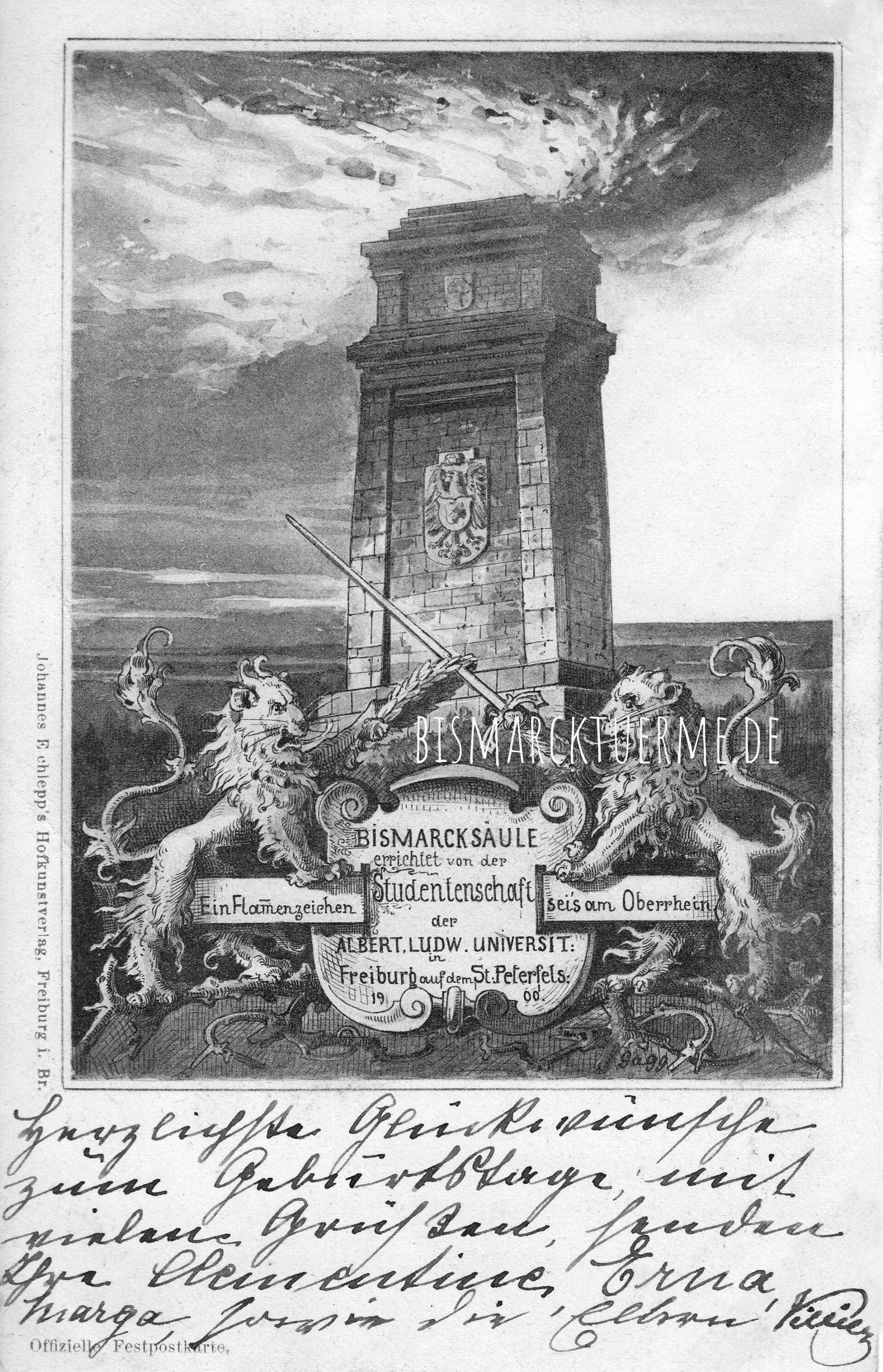 Die feierliche Einweihung der Bismarcksäule erfolgte am 28.07.1900 um 18:00 Uhr. Neben elf studentischen Korporationen nahmen Vertreter der Universität und der Stadt Freiburg/Breisgau teil.