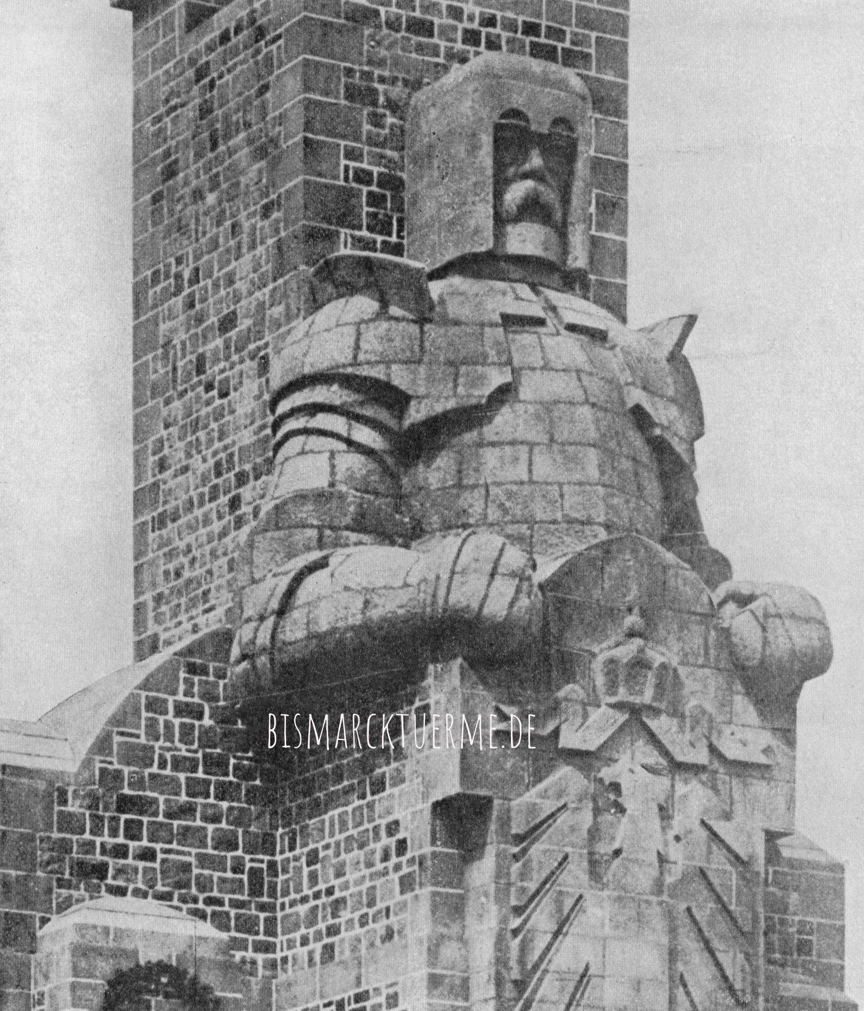 Der Vorbau des Bismarckturmes zeigt eine 15 m hohe Rolandfigur, die im oberen Bereich plastisch aus dem Turm herausragt. Im unteren Teil geht die Figur in die massive Architektur des Turmes über. Der Kopf mit den Gesichtszügen Otto von Bismarcks ist mit einem Helm bedeckt. Der wie ein Ritter gepanzerte Bismarck (Schulterbreite 5 m) hält einen großen Schild des Deutschen Reiches, auf dem sich ein als Relief erkennbarer stilisierter Reichsadler mit Krone befindet.