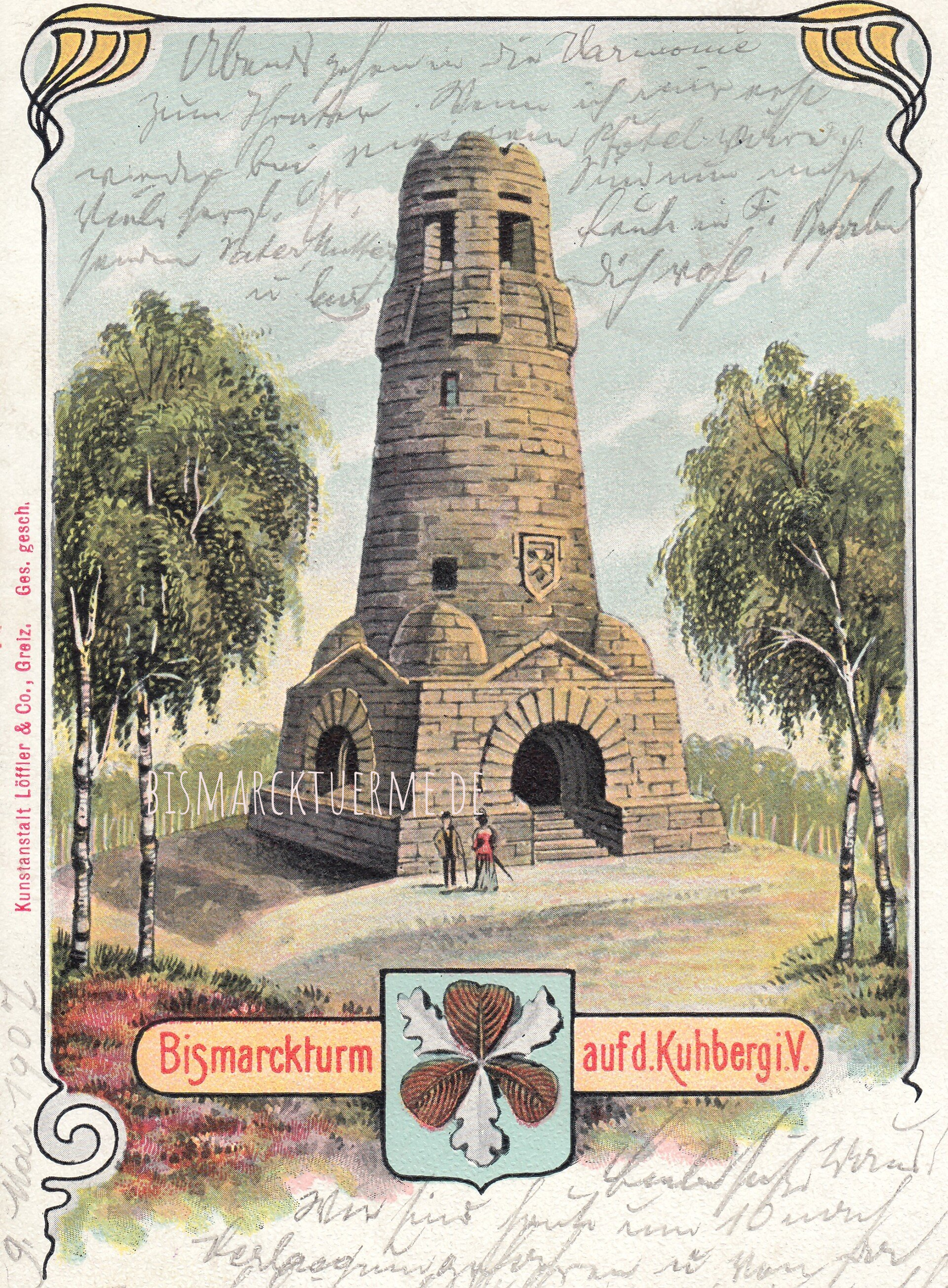 Bereits am 31.07.1899 fand die konstituierende Versammlung des "Ausschusses für den Bau eines Bismarckturmes auf dem Kuhberg" statt. Am 15.08.1899 wurde der leitende Gesamtvorstand gewählt (1. Vorsitzender: Stadtrat Merkel; 2. Vorsitzender Dr. Rud. Neander; Schriftführer: Dr. Doehler; Schatzmeister: Fabrikbesitzer Oswald Popp).