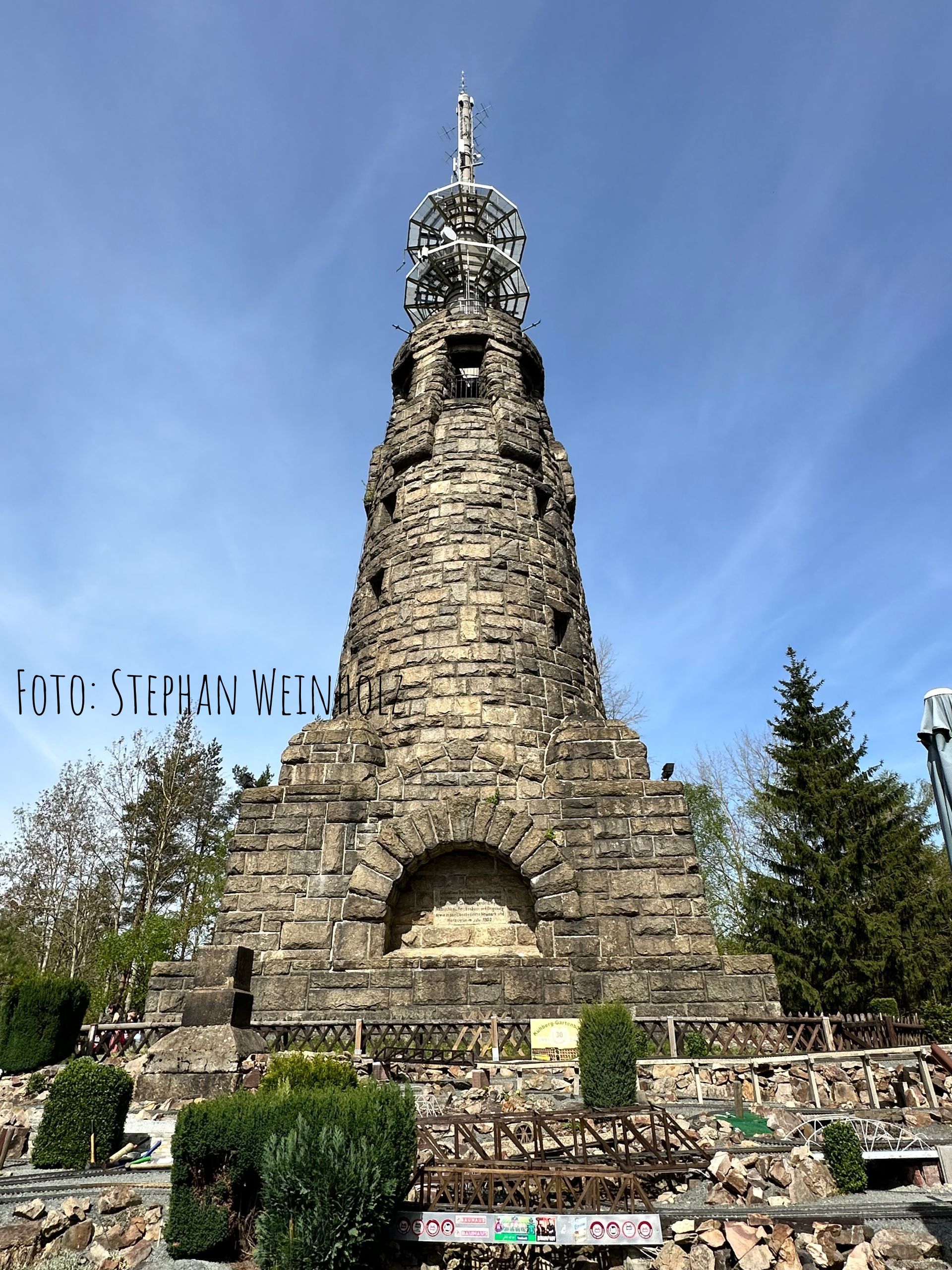 Foto Bismarckturm Netzschkau mit Richtfunkturm im Hintergrund April 2024