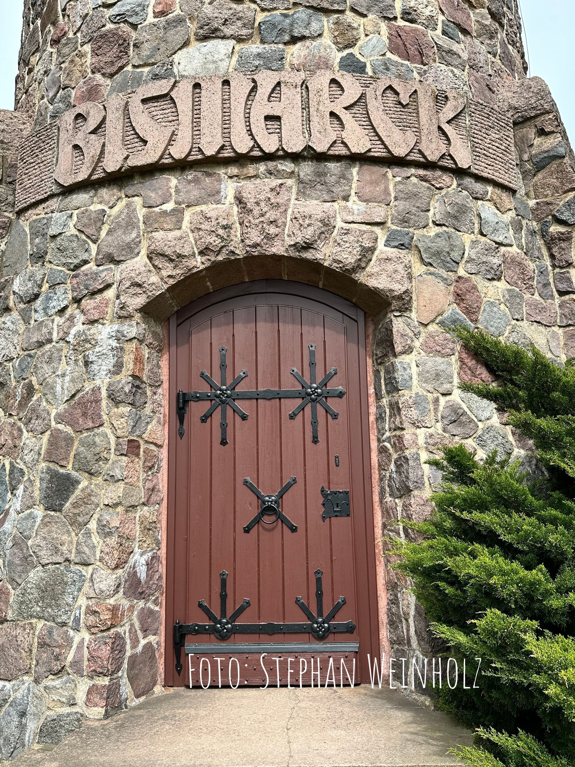 An den beiden großen, an den Seiten des Einganges befindlichen Strebepfeilern sind zwei Datensteine mit dem Geburts- und Todestag von Otto Bismarck angebracht. Die beiden Strebepfeiler sind im oberen Bereich durch das Bismarck-Querband (Material: Granit) verbunden.