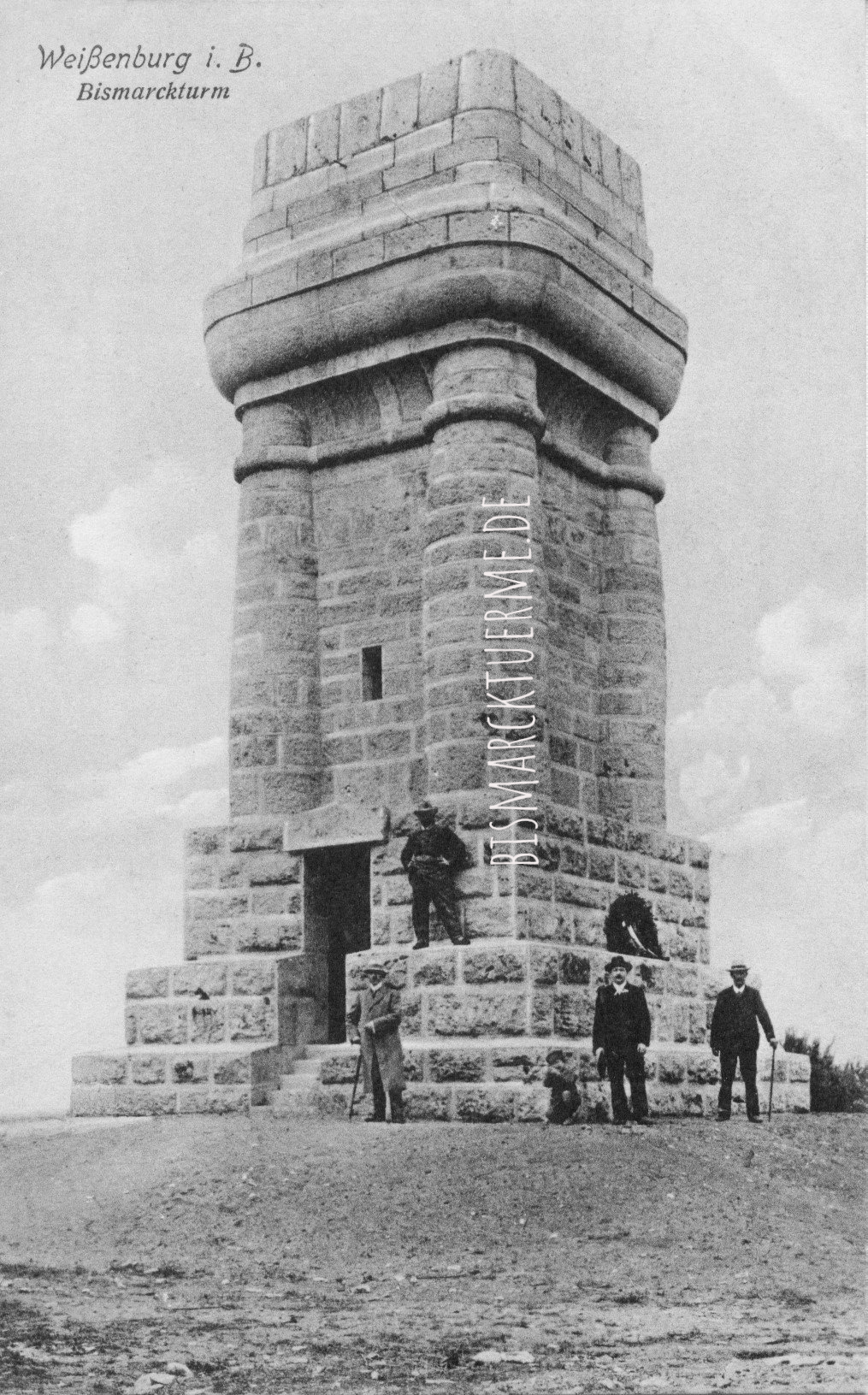 Als Baumeister war Bezirksbaumeister Hans Etschel tätig, der den Entwurf von Architekt Wilhelm Kreis für Weißenburg leicht abänderte. Eine im Kostenvoranschlag vom Dezember 1910 vorgelagerte Terrasse wurde nicht verwirklicht. Die geplante Inschrift "BISMARCK/1815-1898" (auf der Entwurfzeichnung vorhanden) am Turm wurde ebenfalls nicht realisiert.