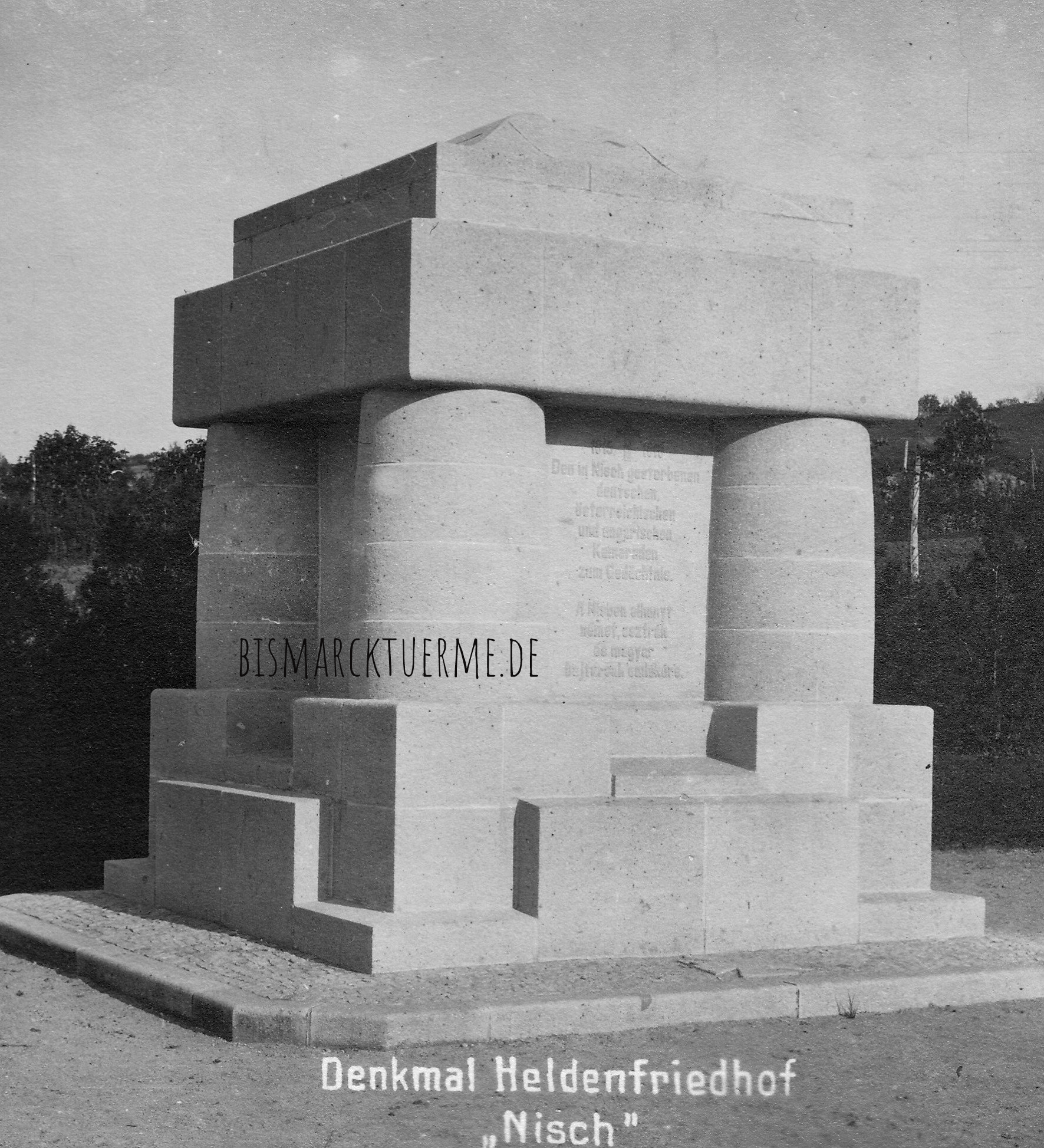 Beschreibung: turmartiger, mehrfach gestufter Gedenkstein auf quadratisch gemauerten Unterbau (mit Bismarck-Medaillon und Inschrift "BISMARCK")