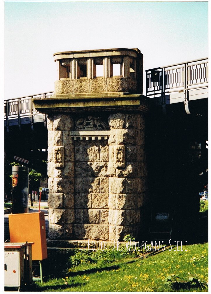 56 m lange Hochbahn-Brücke mit genieten Stahlbögen und mehreren massiven steinernen Widerlagern in Form des Bismarcksäulen-Entwurfs "Götterdämmerung".