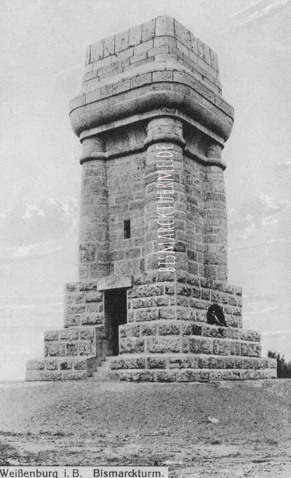 Als Baumeister war Bezirksbaumeister Hans Etschel tätig, der den Entwurf von Architekt Wilhelm Kreis für Weißenburg leicht abänderte. Eine im Kostenvoranschlag vom Dezember 1910 vorgelagerte Terrasse wurde nicht verwirklicht. Die geplante Inschrift "BISMARCK/1815-1898" (auf der Entwurfzeichnung vorhanden) am Turm wurde ebenfalls nicht realisiert.